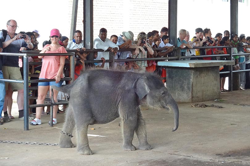 Baby elephant chained for tourists to bottle feed at Pinnawala Elephant Orphanage